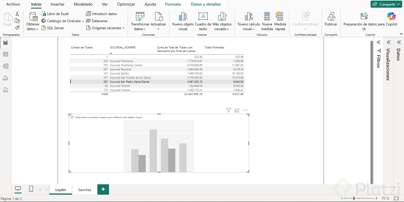 En nuestro caso de estudio, para entender cómo el tiempo influye en las ventas de nuestras tiendas, comenzamos abriendo nuestro reporte. Al estar en nuestro reporte, lo primero que hacemos es un gráfico para visualizar las ventas a lo largo del tiempo.