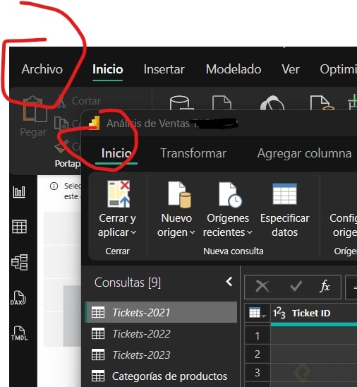 Cuando los datos están separados por año —como ocurre con las pestañas de tickets de 2021, 2022 y 2023— lo primero es corregir los encabezados. En las tablas de 2022 y 2023 se debe hacer clic en "Usar la primera fila como encabezado" [01:07]. Power BI agrega automáticamente un paso que asigna tipos de dato; por ahora conviene eliminarlo para evitar conflictos.