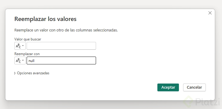 - Seleccionar la columna y acceder a Transformar > Reemplazar los valores.