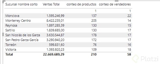 Interacción visual con tablas: Ordena las tablas por conteo de productos o vendedores para evaluar su impacto en las ventas totales. Esto ofrece una vista rápida de cuáles son las sucursales más efectivas en ventas respecto a la cantidad de productos o vendedores que manejan.