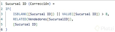 IFpara establecer condiciones y acciones. En este caso, identificamos sisucursal IDestá en blanco y asignamos el valor correcto usando la funciónRELATEDde DAX.NuevaColumna = IF(ISBLANK(Tickets[sucursal ID]), RELATED(Vendedores[sucursal ID]), Tickets[sucursal ID]) -