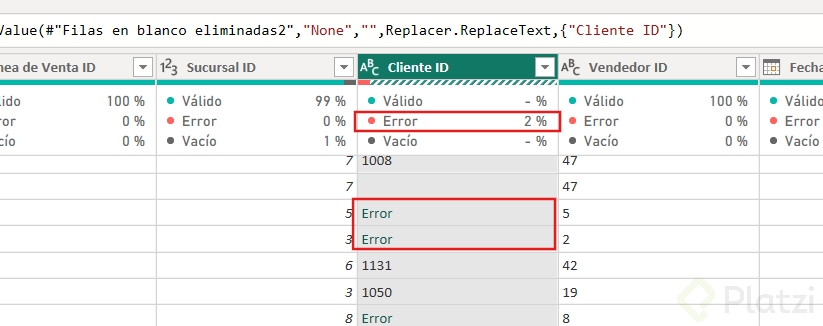 Trabaja en la tabla de vendedores aplicando los mismos principios: usa la primera fila como encabezado y ajusta tipos de datos incorrectos. Verifica que no haya valores en blanco ni inconsistencias y que el tipo de datos ID esté correctamente ajustado a texto.