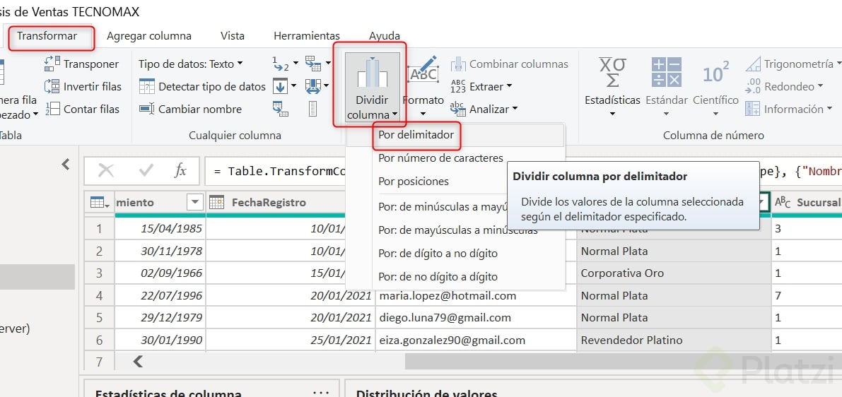 Accede al menú de "Transformar" y selecciona "Dividir columna por delimitador". Tal como lo describes, elige el "espacio" como tu delimitador, aplica las opciones por defecto y presiona aceptar. Tras este cambio, asegúrate de renombrar las nuevas columnas para reflejar su contenido: "Tipo de cuenta" y "Nivel de cuenta".