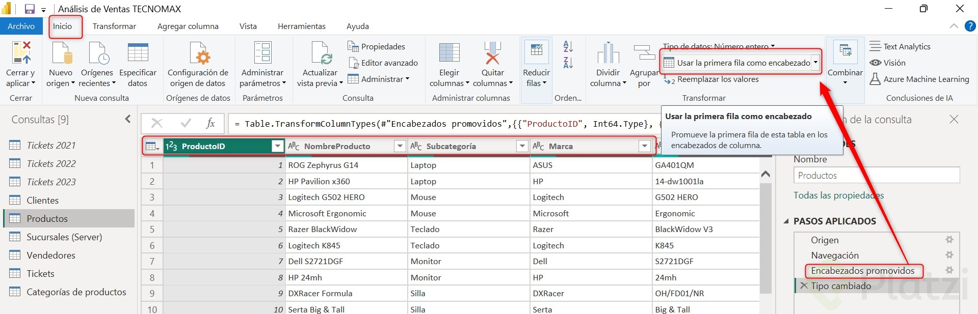 Para hacerlo en Power BI, simplemente ve a la opción que dice "Usar primera fila como encabezado". Esta acción ajustará inmediatamente la estructura de tus datos, facilitando cualquier análisis posterior.