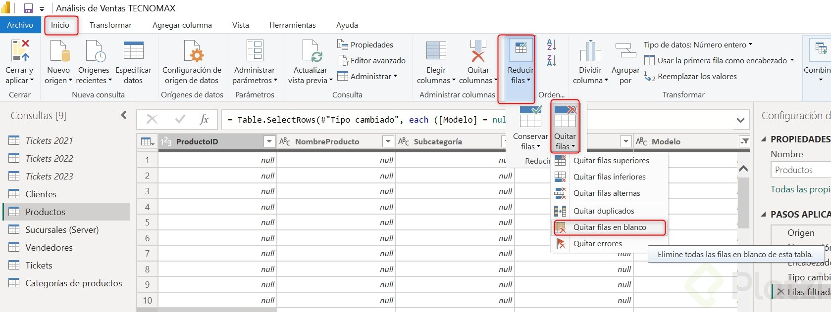 En la tabla de productos, podrías encontrar registros completos en blanco. Para manejarlos, ve a "Reducir filas" y selecciona "Quitar filas en blanco". Esto asegurará que solo queden los datos útiles. Además, verifica que las barras de estado de tus columnas estén verdes; esto asegura que no haya errores.