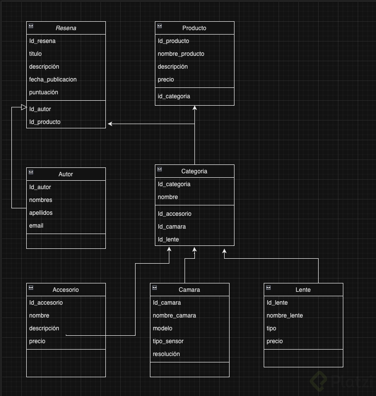 - Producto: Concepto amplio que incluye cámaras, lentes u otros. Esto permite una fácil adaptación del negocio.