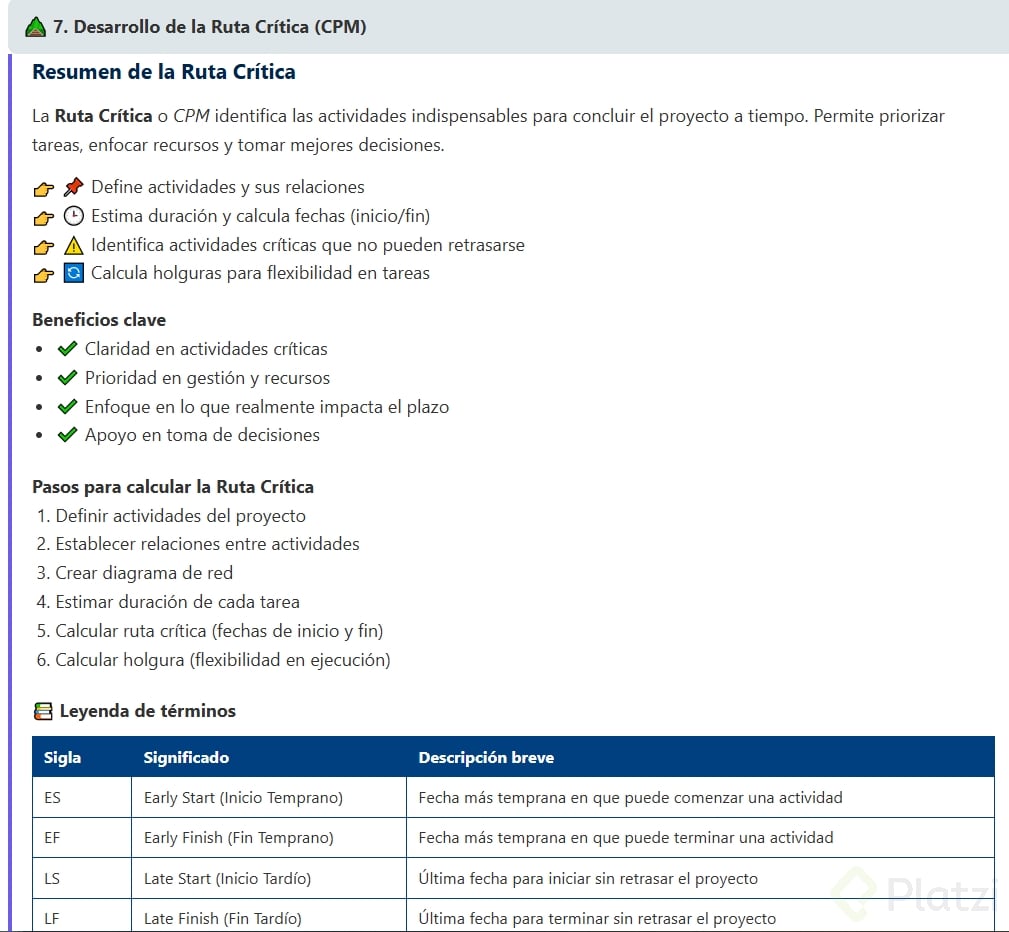 • Nos permite identificar y priorizar las actividades críticas que no pueden retrasarse sin afectar el plazo del proyecto.