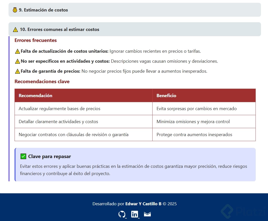 2. No ser específicos con una actividad y costos (elementos que se quedaron sin incluir).