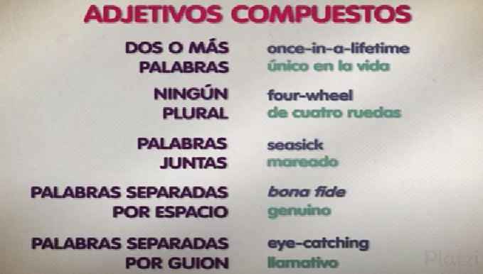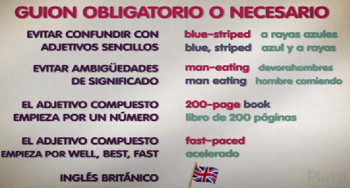 Los adjetivos compuestos o compound adjective’s son combinaciones de palabras mediante un guion (hyphen: -). Algunos ejemplos son: