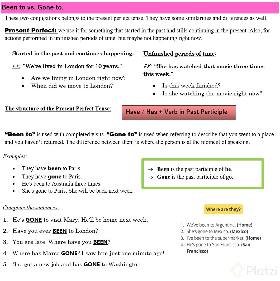Been to: Indica que la persona ha visitado un lugar y ha regresado. Por ejemplo, si decimos "He has been to Paris", se entiende que la persona ya no está en París, sino que ha vuelto a su punto de partida.