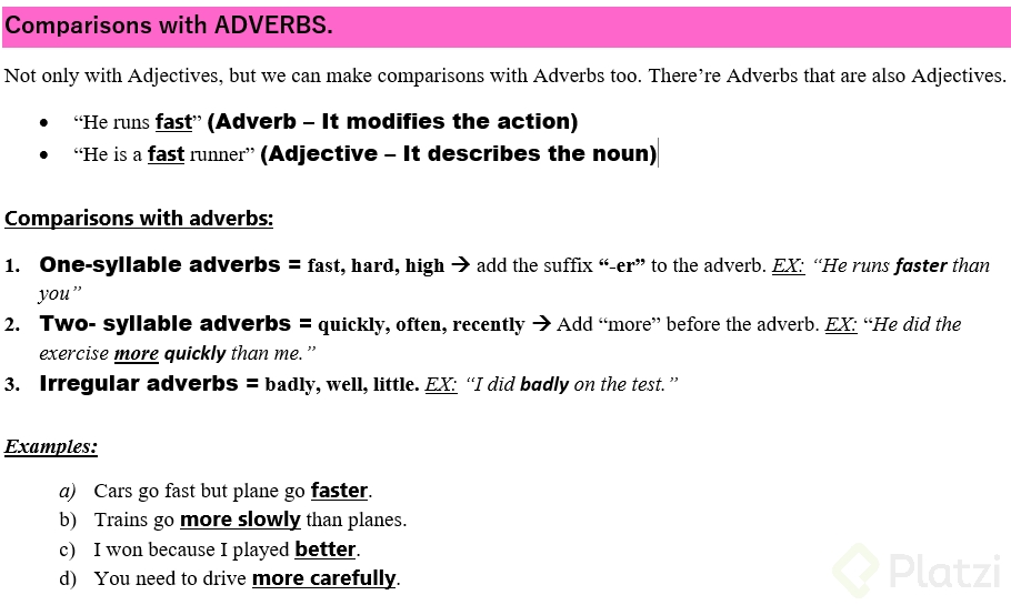 - Para adverbios de una sílaba, como fast, simplemente agrega el sufijo -er al final para formar la comparación. Ejemplo: He runs faster than you.
