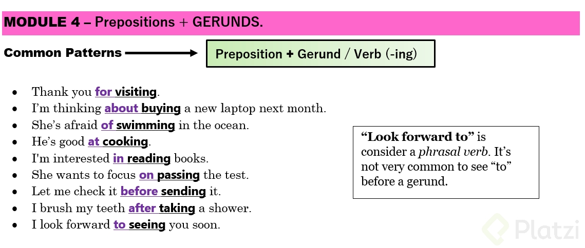 Veamos algunos de los patrones más utilizados que involucran preposiciones y gerundios: