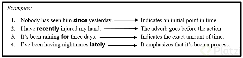 Las expresiones de tiempo son cruciales para precisar cuándo ocurre una acción. A continuación, se presentan algunas expresiones junto con sus aplicaciones en el presente perfecto y el presente perfecto continuo: