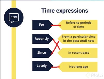 Utiliza las expresiones de tiempo estratégicamente: Empareja "for" con duraciones y "since" con momentos de inicio. Usa "recently" y "lately" para actividades que sucedieron en el pasado reciente.
