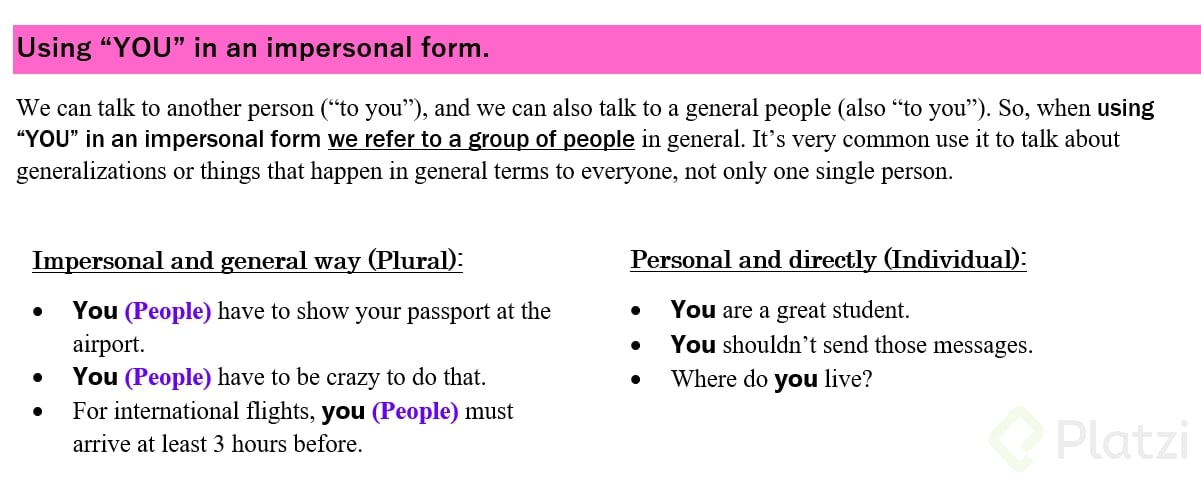 - Practica identificando si una oración es personal o impersonal. Intenta suplantar you con people en diferentes oraciones.