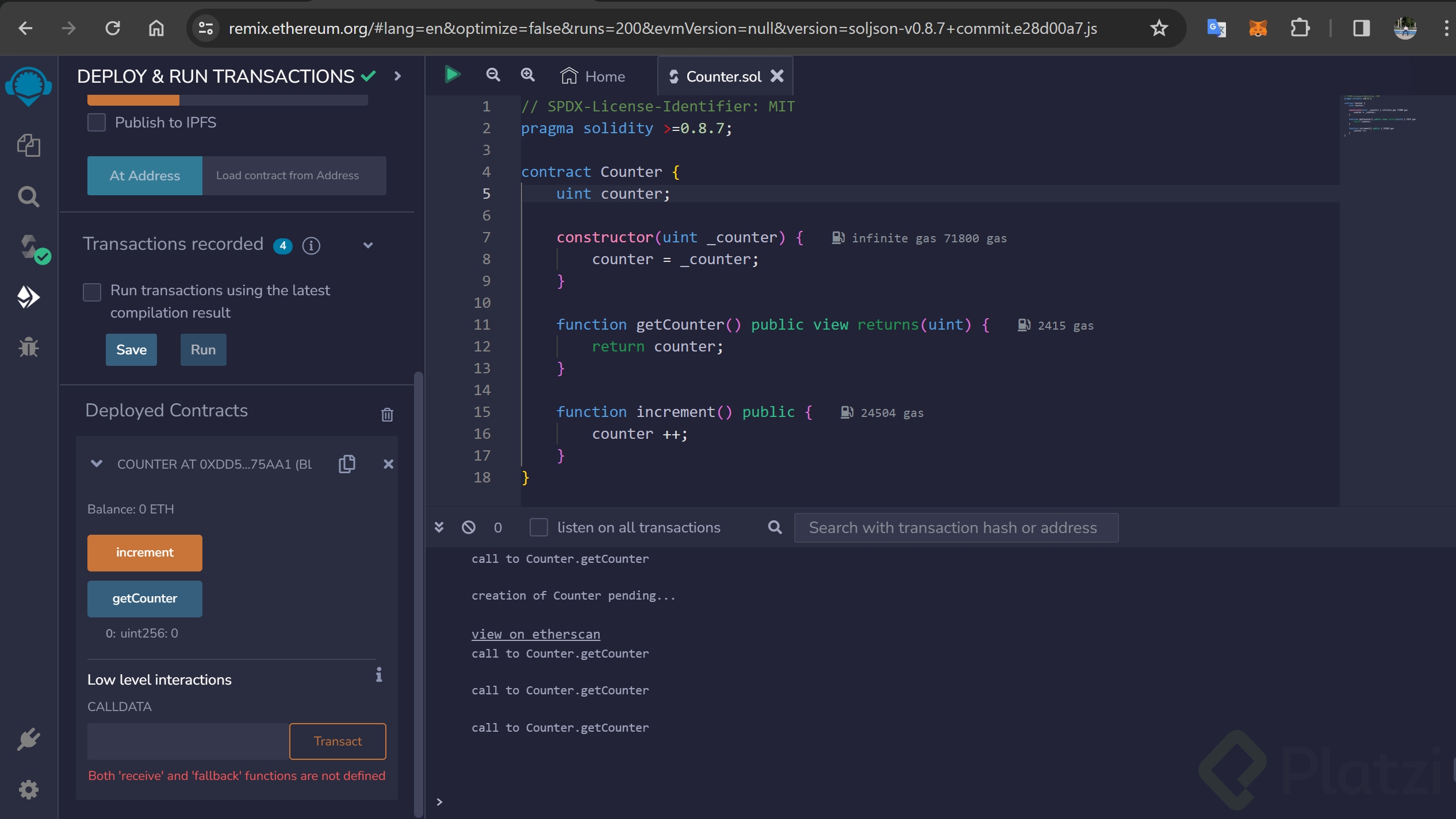 Por defecto, los contratos en Remix se despliegan en una blockchain virtual, única para ti. Podrás observar múltiples wallets con 100 Ether cada una, para jugar y aprender a desarrollar en blockchain. No necesitas tu propia wallet.