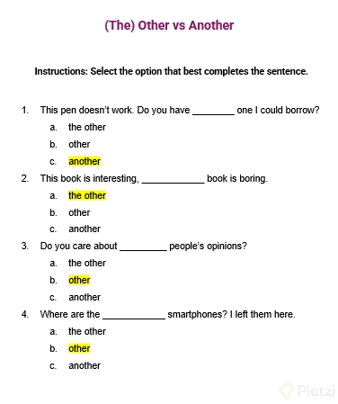 Aprender a utilizar correctamente las palabras the other, another y other en inglés puede enriquecer significativamente tu habilidad para comunicarte de manera efectiva en este idioma. Aunque estas expresiones pueden parecer similares, su uso depende de contextos específicos. Aquí, aprenderás a distinguir entre ellas para utilizarlas con confianza en tus conversaciones diarias.