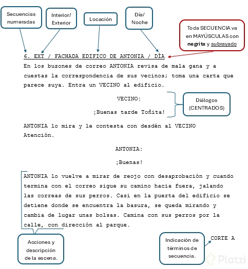 - Acciones y descripciones en minúscula: Estas deben estar sin sangría, destacando los nombres de los personajes en mayúscula.