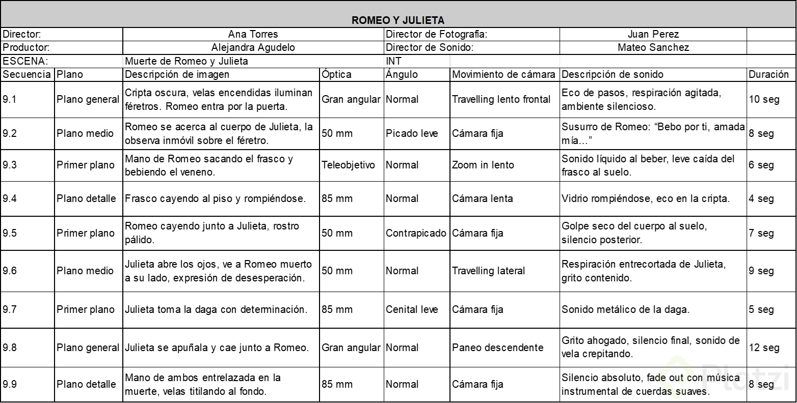 - Planificación logística: Información clave sobre el movimiento de la cámara, ángulos y número de tomas que facilitan la coordinación con el equipo humano y técnico.