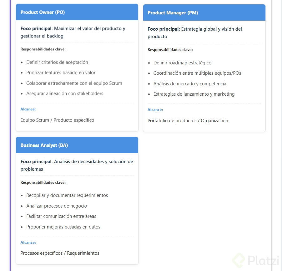 COMPARATIVA CON OTRAS RESPONSABILIDADES Comparativa entre Product Manager y Business Analyst. -Product Manager: crear estrategias para construir productos (van desde la planificación, ejecución y lanzamiento), todo lo necesario para logística del lanzamiento de un producto y más actividades que van más allá de las responsabilidades de un Product Owner de software. Dentro un equipo tiene responsabilidades como de un Product Owner, también puede ser que un Product Manager se encargue del proyecto a un nivel global y tenga uno o varios Product Owners y haciendo partes de ese proyecto. -Business Analyst: ayudar a identificar y definir soluciones que maximicen el valor entregado por una organización a sus partes interesadas. Algunas veces se confunde con el rol de Product Owner, la principal distinción es que un Product Owner puede ser un Business Analyst y trabajar con todas las disciplinas y conocimientos que trae el análisis de negocio, pero ejecutar las responsabilidades de Product Owner en un equipo, también un Product Owner puede trabajar con un analista que lo apoye en sus actividades. Una diferencia entre los Business Analyst y los Product Owner, es que los Business Analyst no priorizan, sencillamente facilitan información para la toma de decisiones.