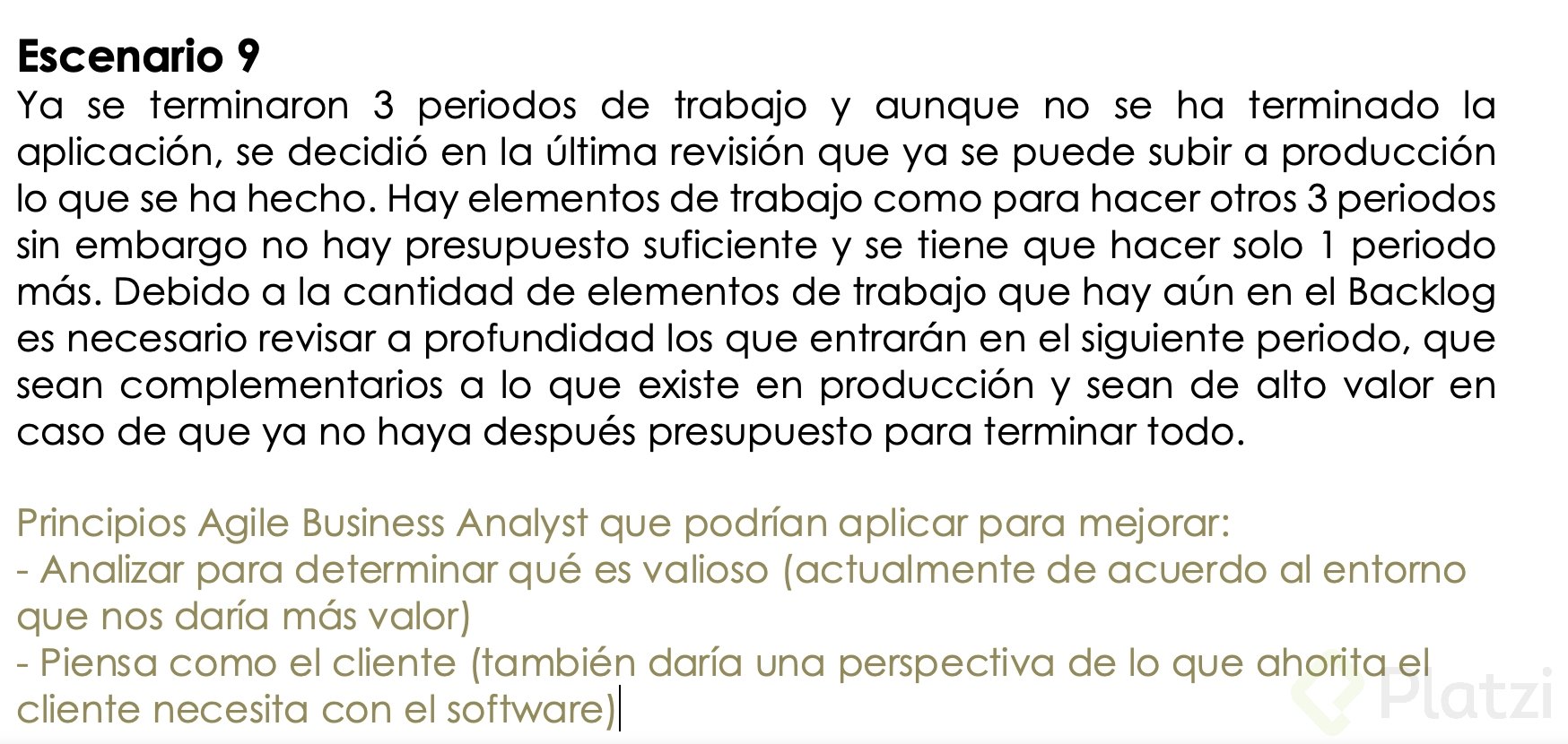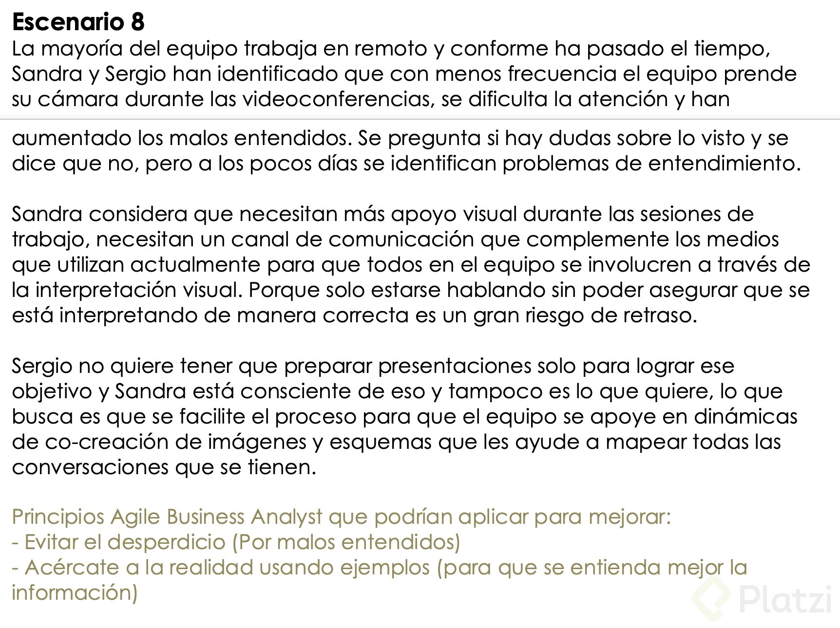 Principios del ágile business analysis que pueden en los escenarios 8 y 9. Escenario 8. Una manera rápida de propiciar la colaboración en la interacción con el equipo (que es lo que está generando problemas de desperdicio y retrabajos) se puede aplicar la técnica de hablar con ejemplos y pedir ejemplos. De esta manera los colaboradores pueden tener sinergia entre la factibilidad técnica con todo el contexto del negocio. Escenario 9. Quizás hace falta revisar la visión de todo el negocio para entender que es más factible entre la sinergia del negocio y la técnica y entonces, priorizar con base en la justificación por valor pensando desde el lente del cliente.