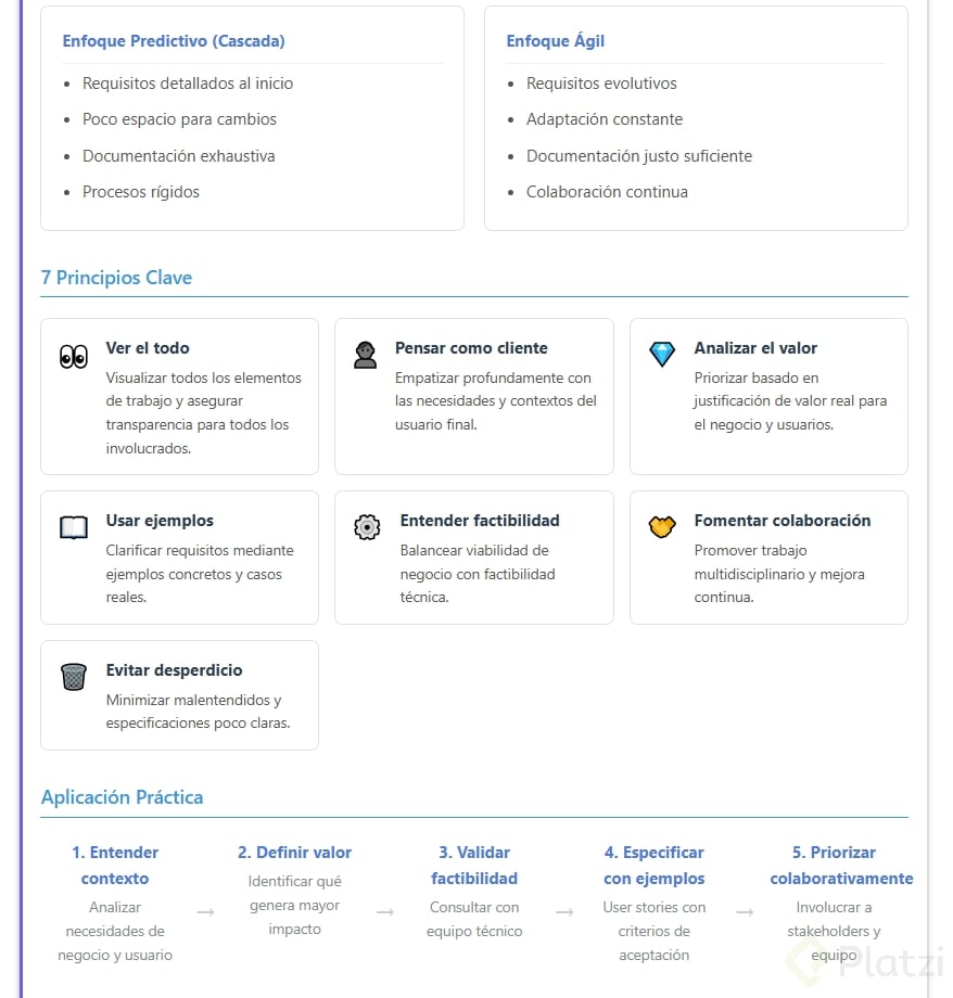 PRINCIPIOS DE AGILE BUSINESS ANALYSIS El conjunto de prácticas, técnicas y conceptos que trae el análisis de negocio, enriquece mucho el trabajo de los PO. Cuando se habla de análisis de negocio agile, tiene una separación o división importante de como se trabaja en métodos en cascada (son para entornos predictivos), en agile (entornos de incertidumbre). • Ver el todo: Se refiere a visibilizar todos los elementos de trabajo de una manera clara y que esto sea visible para todos los involucrados. El PO debe ver la manera de que la información le llegue a todos por igual. • Piensa como cliente: es nuestra orientación principal, los esfuerzos van encaminados a que el cliente use lo que estamos haciendo. Es muy importante empatizar y ponerse en los zapatos del cliente. • Analizar para determinar qué es valioso: analizar que es valioso invita al PO a estar haciendo un análisis y priorización con base en la justificación por valor. • Acércate a la realidad usando ejemplos: la mejor manera para que algo quede claro, es ejemplificando, al dar ejemplos se fortalece el entendimiento. • Entiende que es factible: no solo existe la factibilidad de negocio, también existe la factibilidad técnica, es importante unir las dos perspectivas de factibilidad y poder hablar con el equipo de desarrollo sobre complejidades. • Estimular la colaboración y la mejora continua: la agilidad se mueve en entornos colaborativos, y el software es el resultado de un trabajo multidisciplinario, sin colaboración simplemente no sucede, es vital fomentar la colaboración. • Evitar el desperdicio: del lado del PO es importante considerar que la tendencia fundamental en los proyectos sigue siendo los retrasos por malentendidos, por confusiones o porque una especificación no quedo lo suficientemente clara, el principal de los desperdicios se evita con conversaciones, con entendimiento y aplicando las practicas habladas hasta el momento.