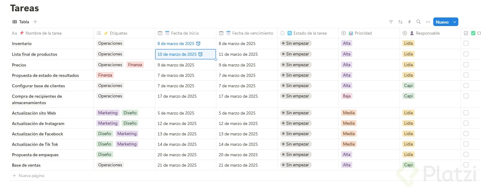 - Tareas: estado, fechas de entrega y prioridad.