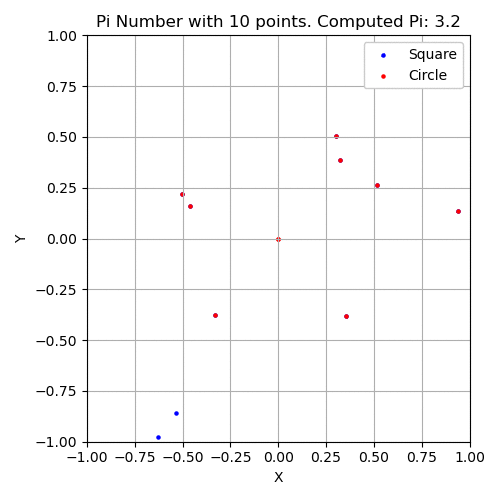 aventar_agujas: Esta función recibe el número de agujas como parámetro.def aventar_agujas(numero_agujas): adentro_del_circulo = 0 for _ in range(numero_agujas): x = random.random() * random.choice([-1, 1]) y = random.random() * random.choice([-1, 1]) distancia = math.sqrt(x ** 2 + y ** 2) if distancia <= 1: adentro_del_circulo += 1 return 4 * adentro_del_circulo / numero_agujas -