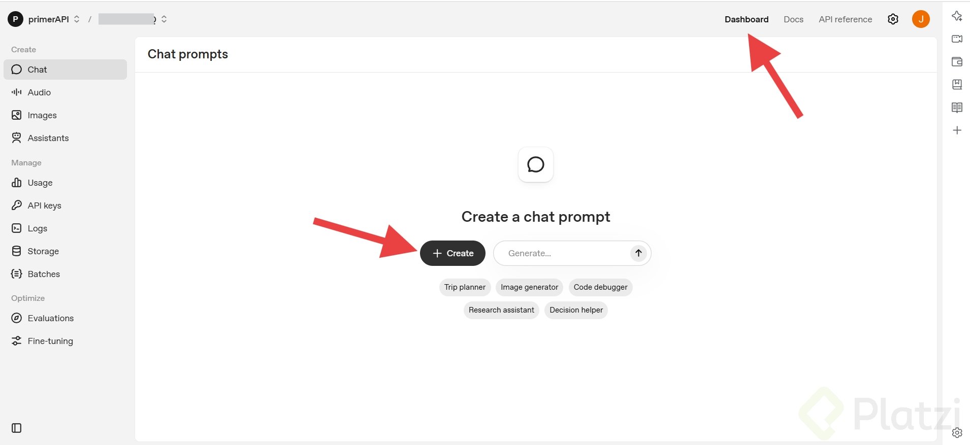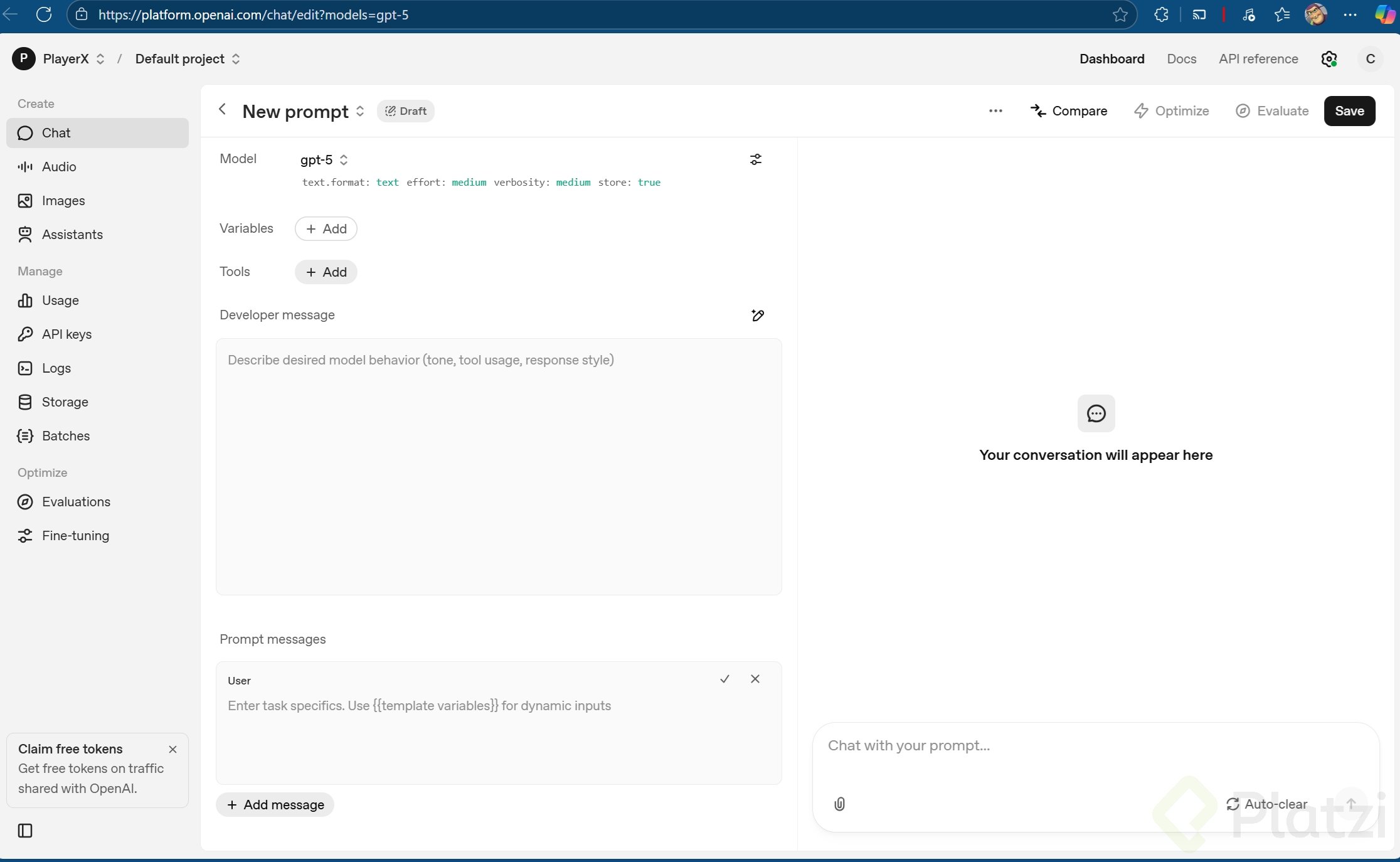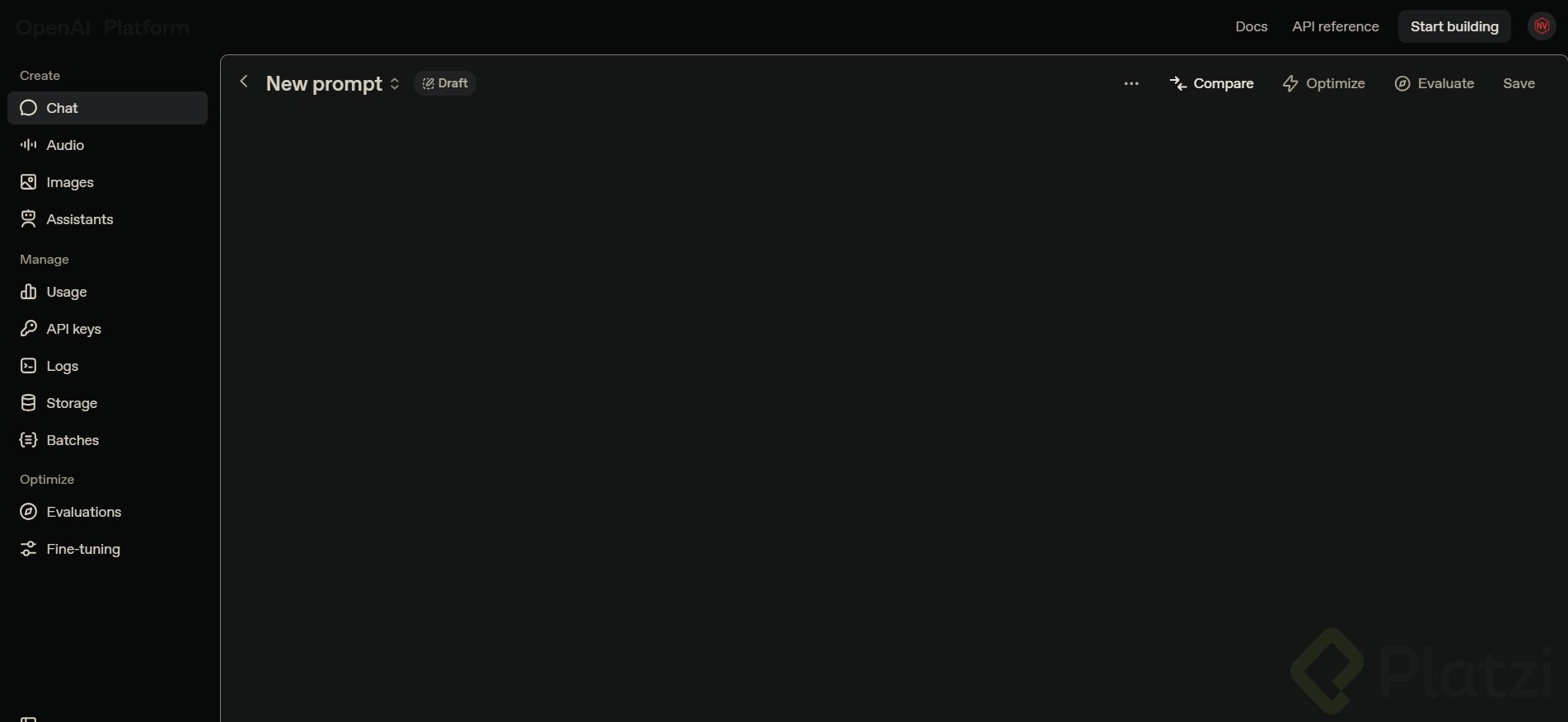 - Sección "Playground" destinada a la creación y prueba de prompts interactivos.