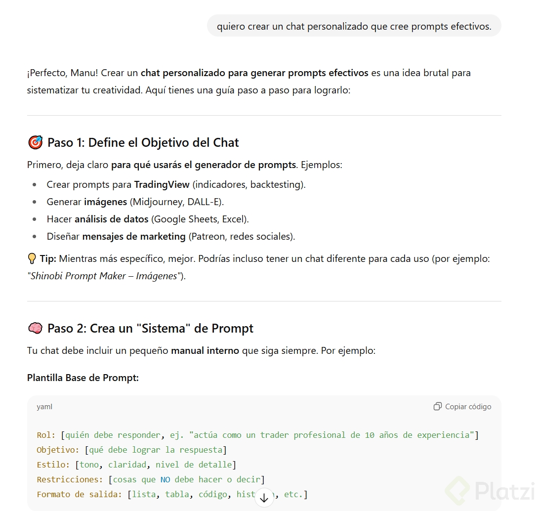 Cada término influye significativamente en lo que generará el modelo. Frases demasiado limitadas pueden cortar la creatividad del asistente virtual, mientras que una guía demasiado amplia podría devolver resultados poco enfocados. Al ajustar las instrucciones se obtiene: