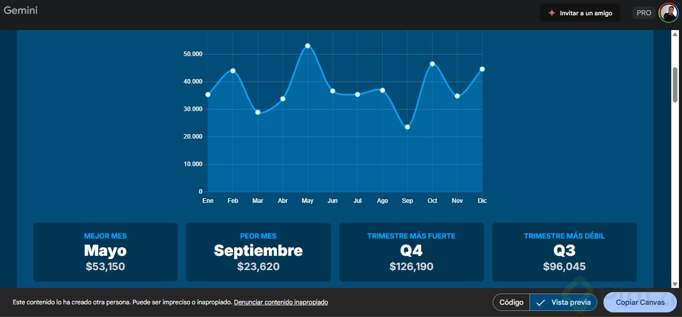 - Ventas mensuales: Mayo y noviembre registraron los ingresos altos, superiores a 4,000 dólares. Febrero y junio fueron meses bajos, con ventas por debajo de los 2,500 dólares.