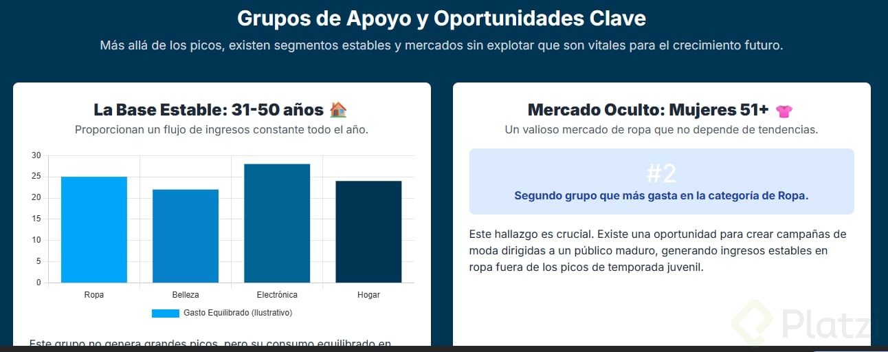 - Patrones por edad: Grupo entre 26 y 35 años gastó más, principalmente en ropa y artículos de belleza.