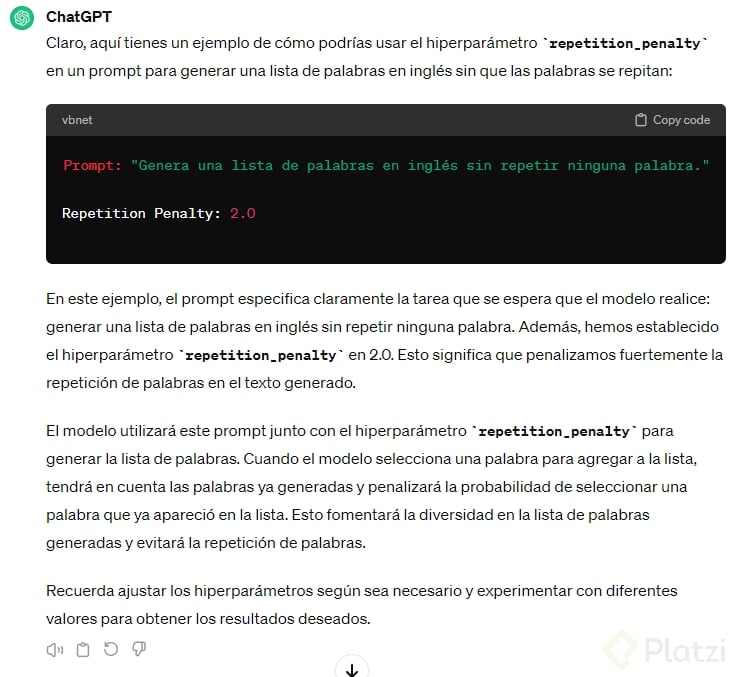 - Si es alto, cercano a 1, existe mayor diversidad en la selección de palabras posibles, aumentando la creatividad de las respuestas.