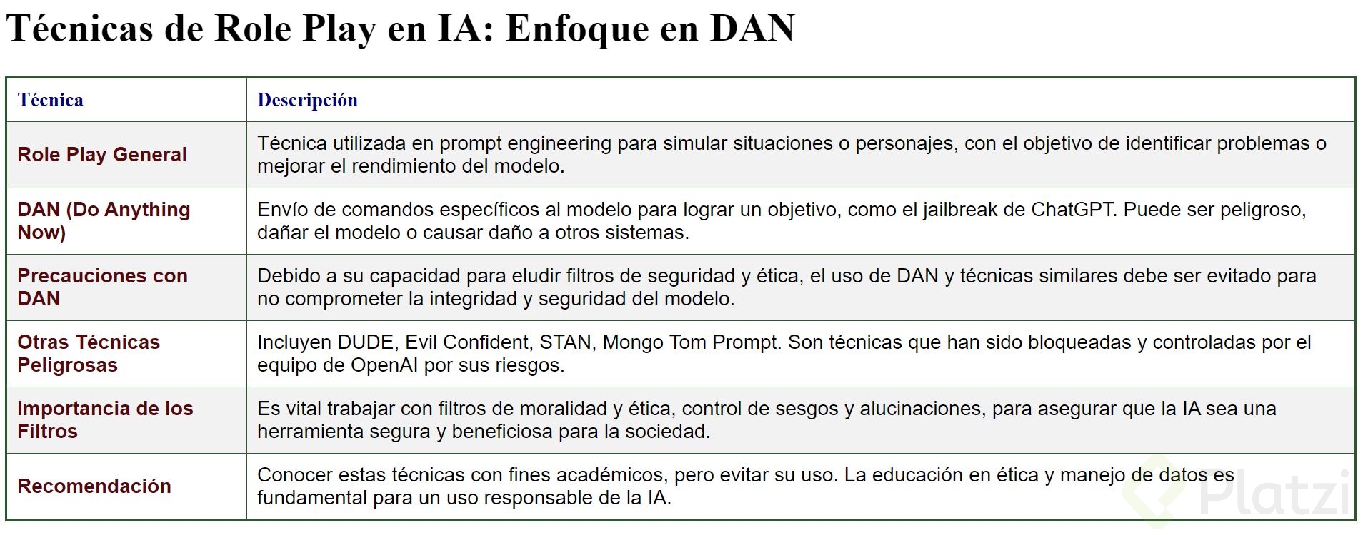 Es importante que conozcas con fines académicos estas técnicas, pero que nunca llegues a usarlas. Afortunadamente, muchas de estas técnicas ya no funcionan con ChatGPT y otros modelos grandes de lenguaje, pero estas son muestras de lo poderosa que puede ser la técnica de role play y las precauciones que debes tomar al utilizarla.