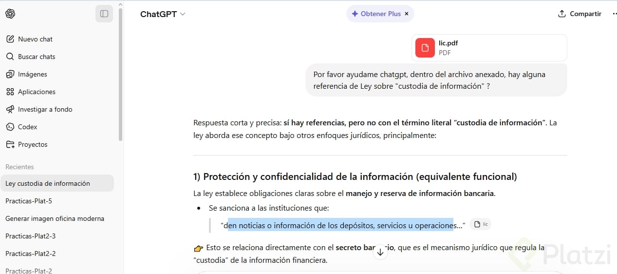 - ChatGPT identificó que sí existía normativa sobre custodia y conservación de la información, citando artículos específicos como el 124 y el 79 [7:11].