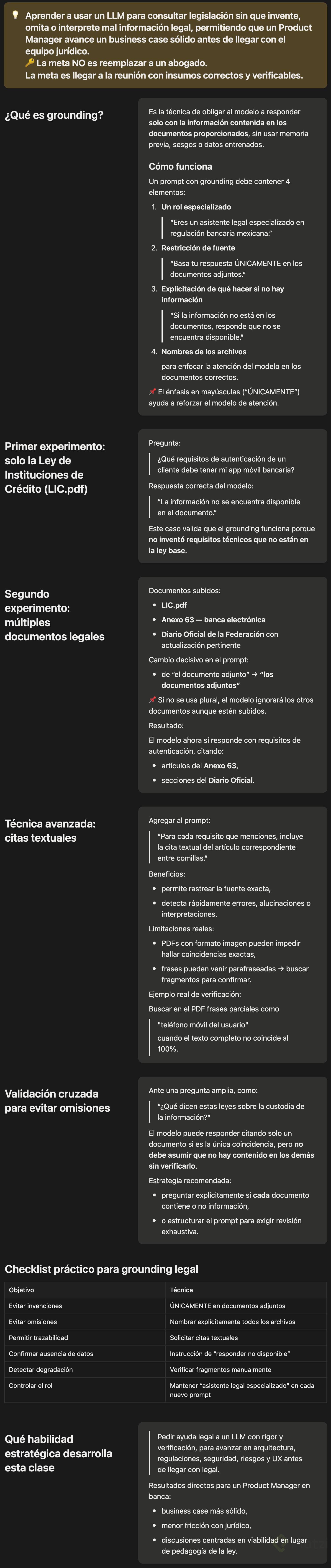 Como product manager en banca mexicana, puedes acelerar un business case para una aplicación móvil sin caer en riesgos legales si dominas técnicas de grounding con un LLM. La clave: respuestas basadas solo en documentos adjuntos, pedir citas textuales y establecer qué hacer cuando la información no está disponible. Con Gemini y su ventana de contexto de un millón de tokens, es posible consultar normativa extensa sin alucinaciones.