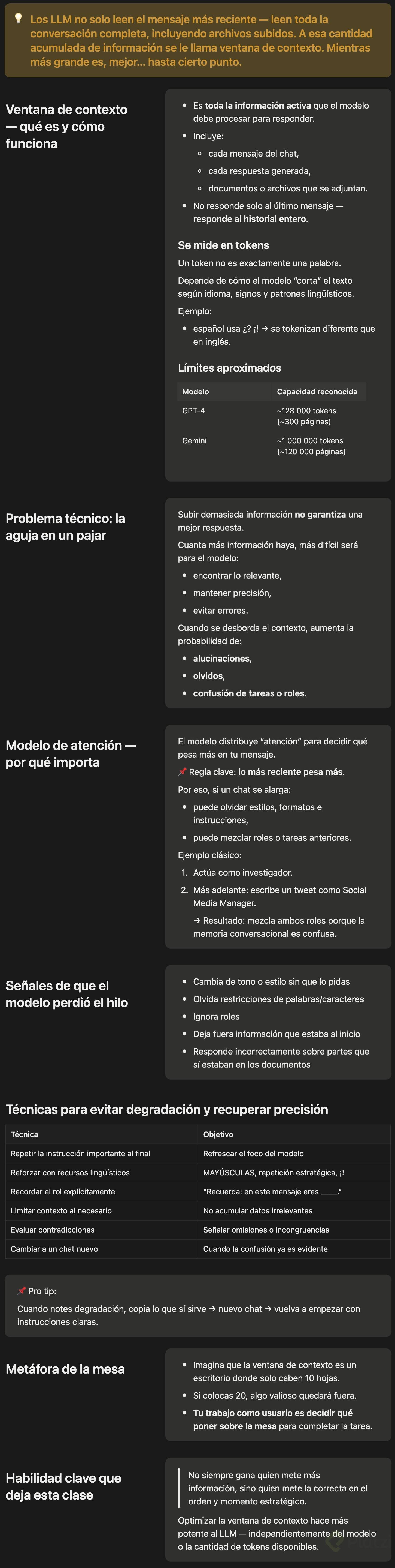 La ventana de contexto es toda la información que el modelo tiene “sobre la mesa” al responder: tu prompt inicial, cada mensaje posterior y los archivos que subes. Todo suma. Por eso, un chat largo o muchos documentos pueden saturarla.