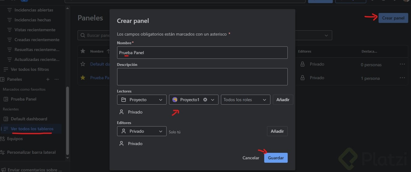 - Selecciona "Paneles" en la parte superior y haz clic en "Crear panel".