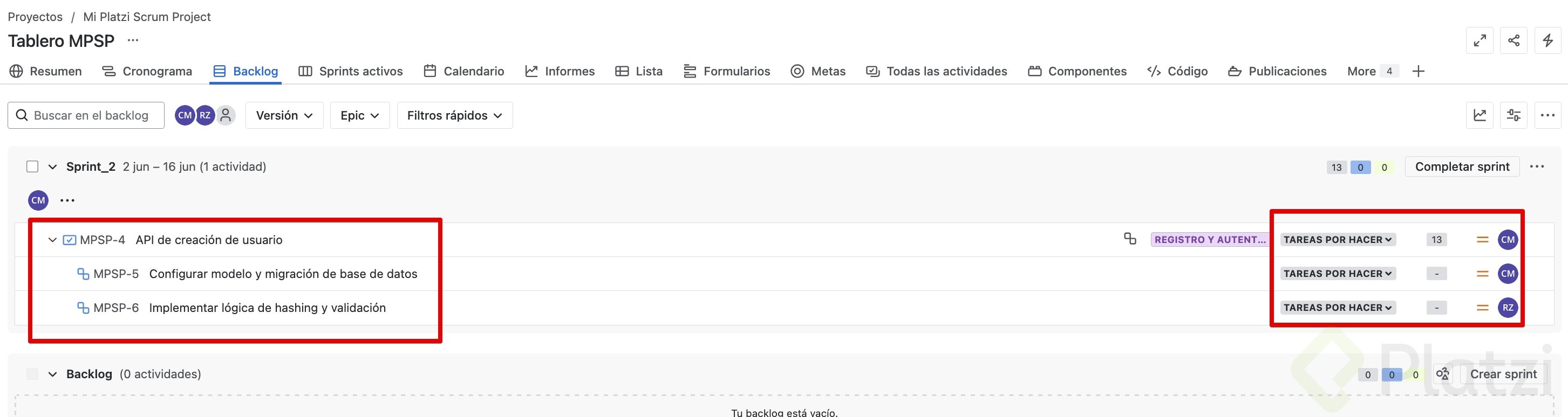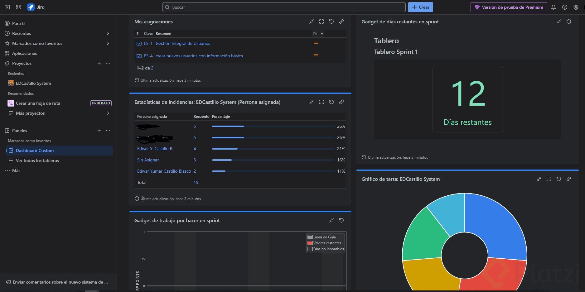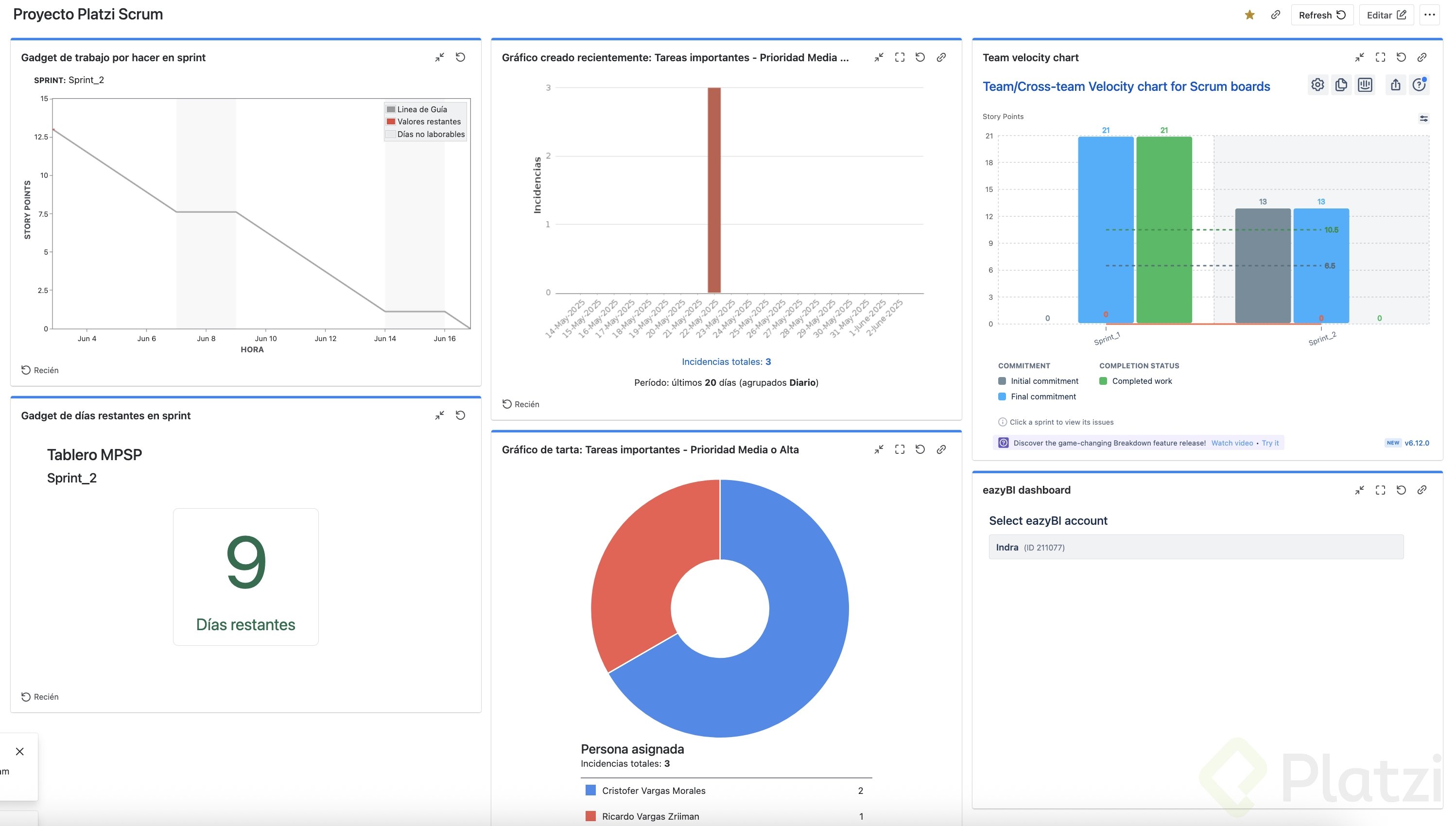 Días restantes del sprint: Muestra el tiempo que queda para completar el sprint actual.