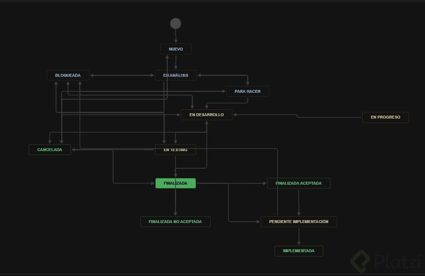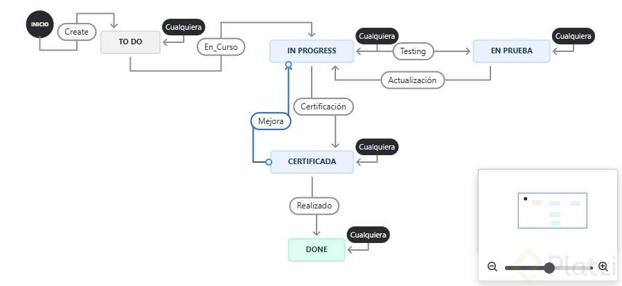 En el flujo de trabajo: Proporciona una vista similar a la que se ve en la configuración del proyecto, mostrando las posibles transiciones entre estados.