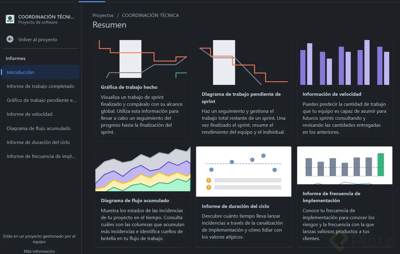 Veamos los principales tipos de reportes que Jira ofrece para el seguimiento de proyectos ágiles.
