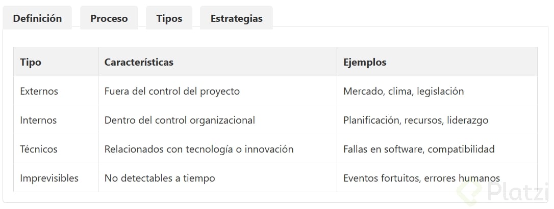- Internos: Asociados a aspectos controlables como el tiempo, costo, alcance o mala planificación interna.