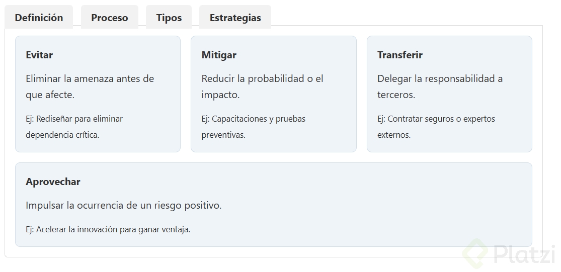 Dependiendo del tipo de riesgo, se pueden aplicar diversas estrategias de respuesta: