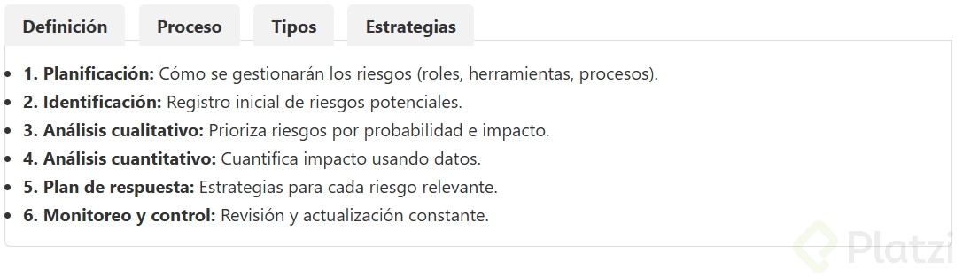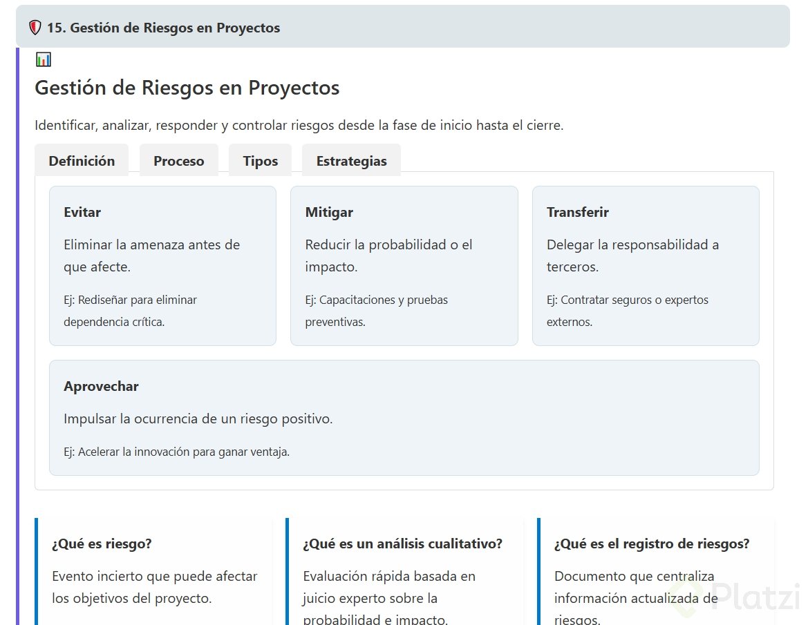 - Control de riesgos: Monitorear constantemente los riesgos durante todo el proyecto, ajustando respuestas según sea necesario.