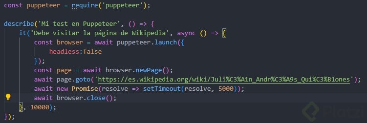 //importar puppeteer const puppeteer = require('puppeteer') //escribir la prueba describe(' Mi primer test en puppeteer',()=>{ it('Debe de abrir y cerrar el navagador', async() =>{ const browser = await puppeteer.launch({ headless: false }) const page = await browser.newPage() / await page.goto('https://es.wikipedia.org/wiki/Wikipedia:Portada') //el navegador.. navega a.... await page.waitForTimeout(1000) await browser.close() }) })