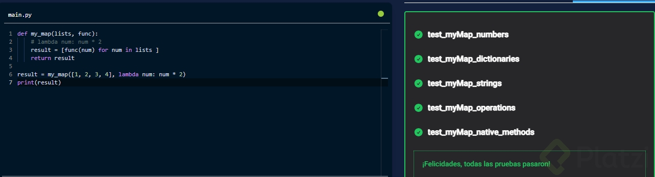 def my_map(list, func): # Tu código aquí 👈 return [func(x) for x in list]