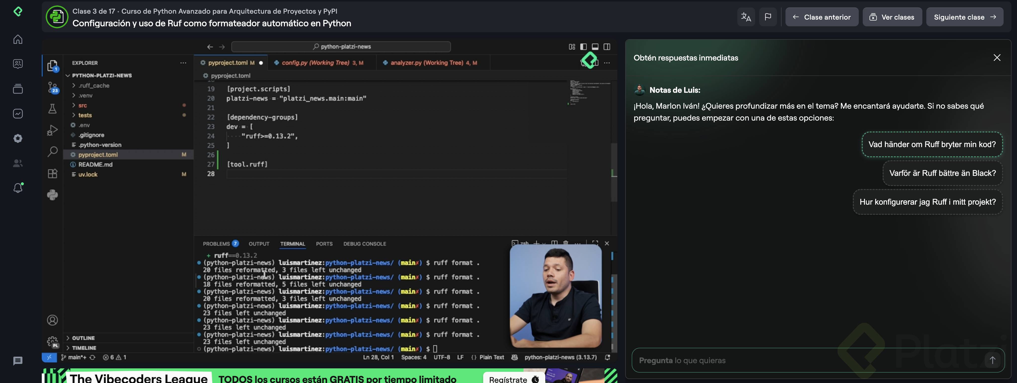 Mantener un código consistente y legible acelera el trabajo en equipo. Aquí aprenderás a configurar Ruf como formateador automático en Python, reemplazando herramientas como Black y Sort, aplicando PEP 8 por defecto y ajustando reglas desde pyproject.toml. Verás cómo formatear todo el proyecto, personalizar comillas y excluir rutas generadas por un framework.