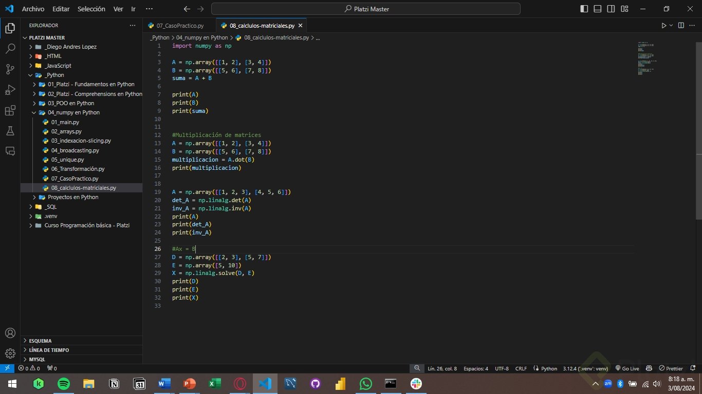 Estas operaciones son la base para el manejo de datos en grandes volúmenes, y pueden ser extendidas a situaciones más complejas dependiendo del tipo de problema que enfrentes. Explorar y practicar con estas herramientas te ayudará a fortalecer tus habilidades en ciencia de datos y Machine Learning. ¡Sigue explorando y dominando el fascinante mundo del álgebra lineal y NumPy!
