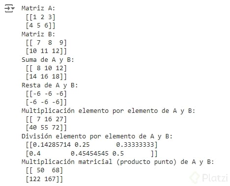La suma y la resta de matrices con NumPy es directa. Basta con utilizar los operadores + para adición y - para sustracción, respectivamente.