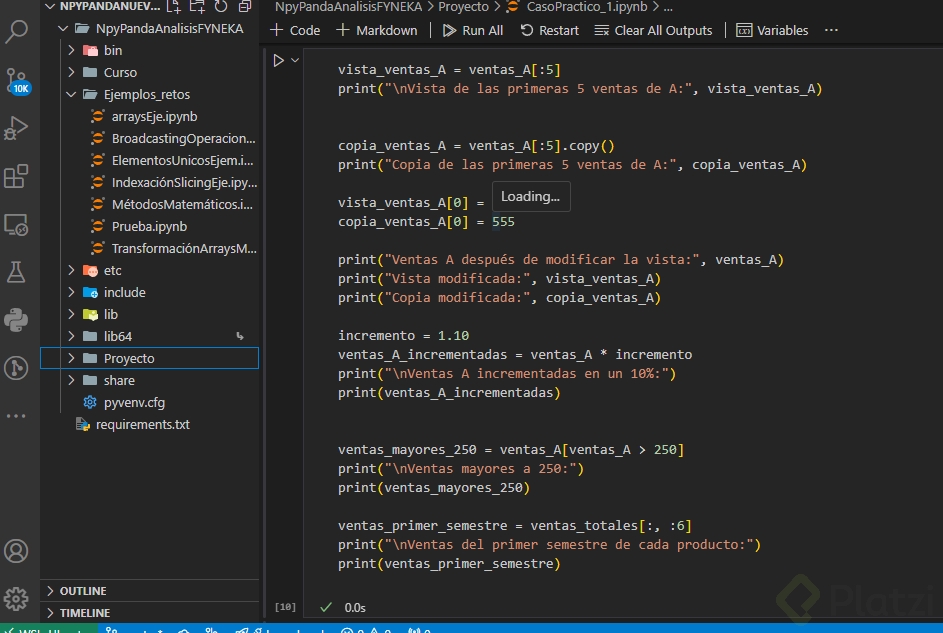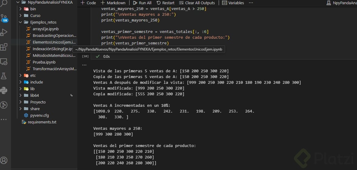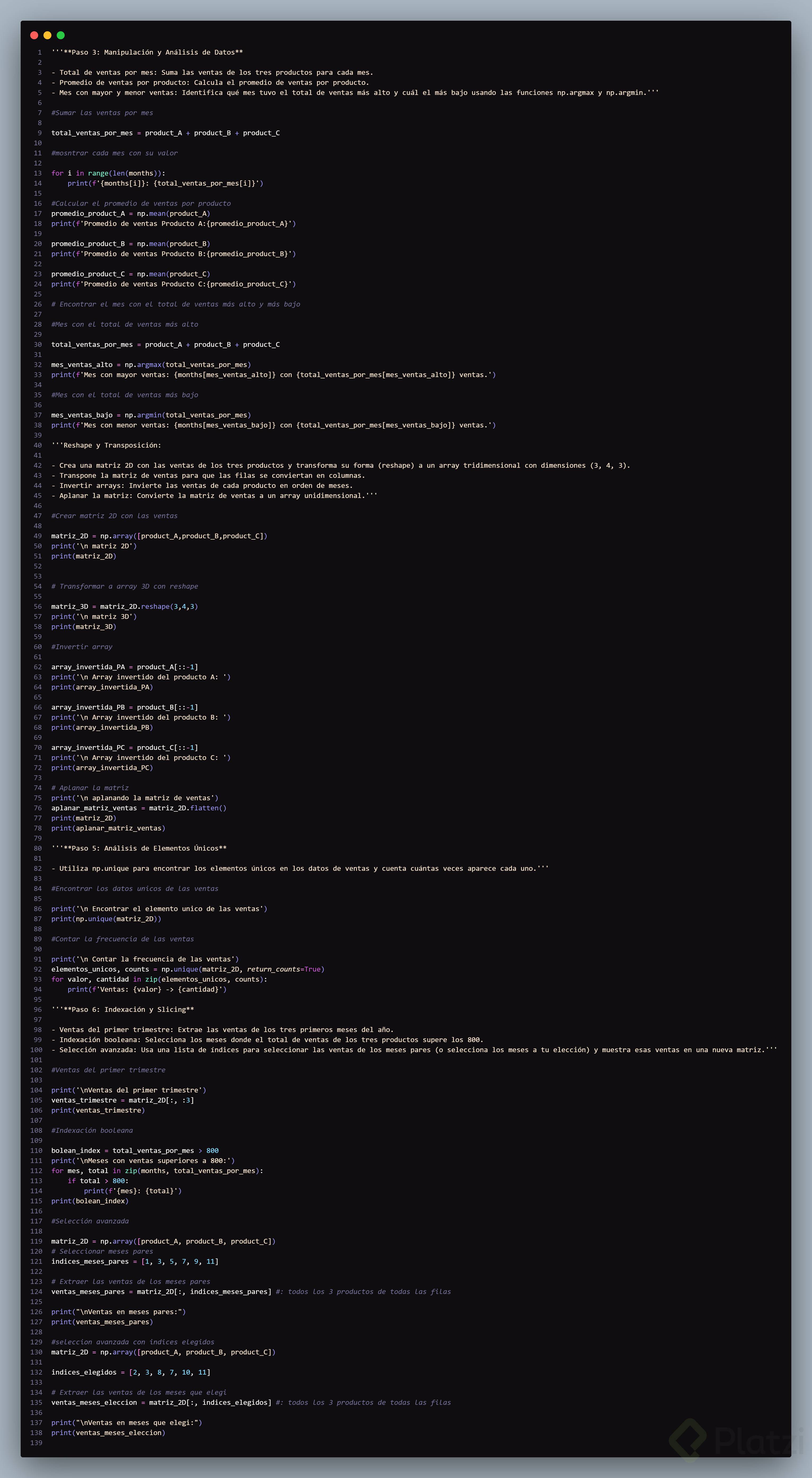 El objetivo de este ejercicio es trabajar con arrays de NumPy para analizar y manipular datos de ventas de tres productos a lo largo de un año. A través de diversas operaciones, explorarás cómo usar NumPy para obtener estadísticas, realizar manipulaciones avanzadas y aplicar técnicas de indexación para extraer información clave.